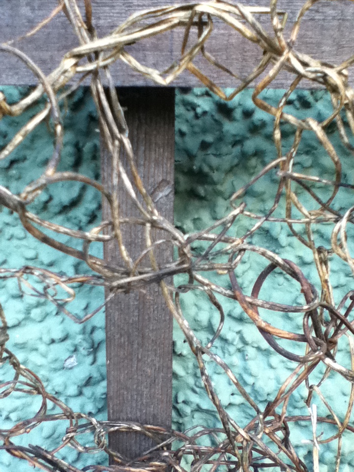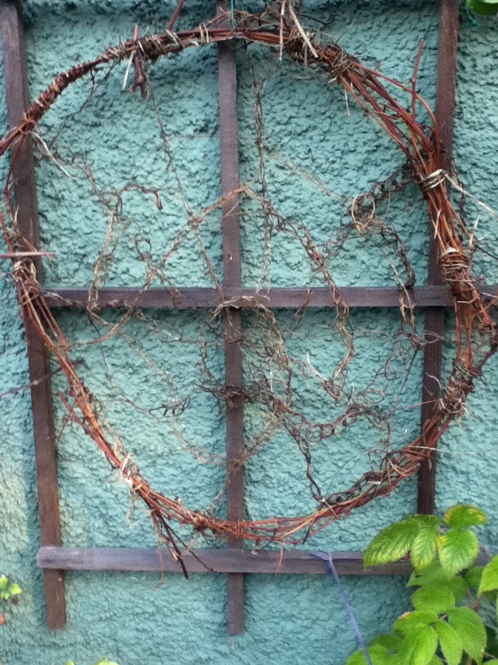 Hallowe’en Spider Webs from Grapevine and crocheted morning glory (“bindweed”).
