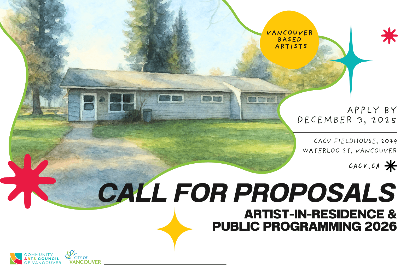 The Community Arts Council of Vancouver (CACV) invites applications from Vancouver-based artists to apply for Artist-in-Residence and Workshop Facilitator at the McBride Fieldhouse (2049 Waterloo St., Vancouver, BC).