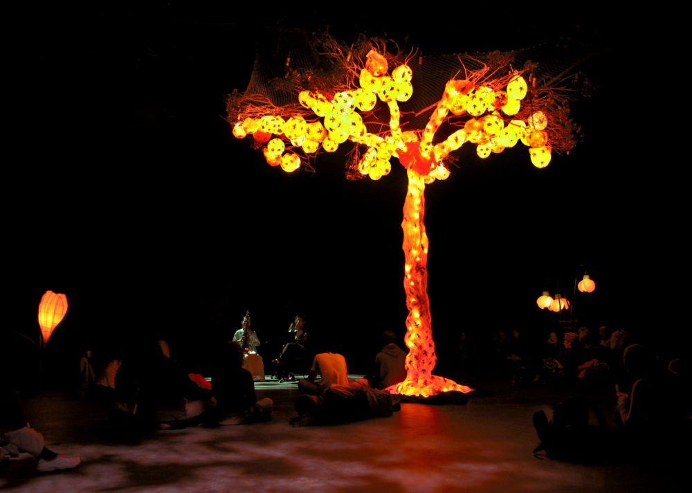 Naomi: In Dr. Sun Yat-Sen Classical Chinese Gardens there is a beautiful Ginkgo tree. One fall, we went down and collected the moist leaves just before they fell and stored them in the freezer. When it was time to create our lanterns in December, we thawed the leaves and incorporated them into the lanterns to hang in that same Ginkgo tree. It was our way of giving the tree back its leaves.