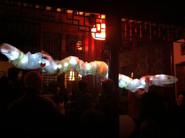 Our new snake lantern designed by Jacquie Rolston and created at our Eco-Arts Salon December 11, 2012, had its first public appearance at Dr. Sun Yat-Sen Classical Chinese Garden on Winter Solstice, December 21, 2012. Click here to see a 12 second video clip.